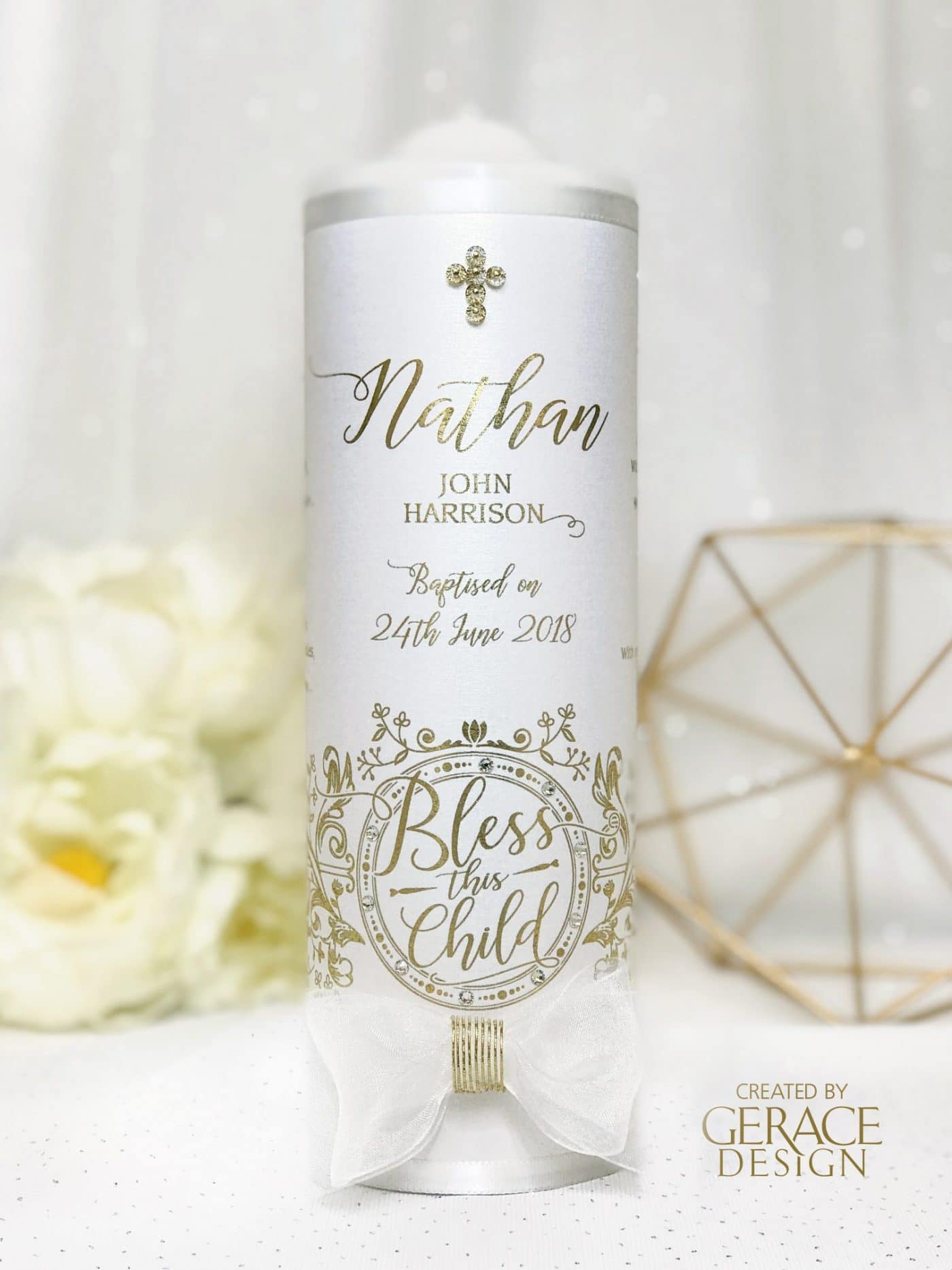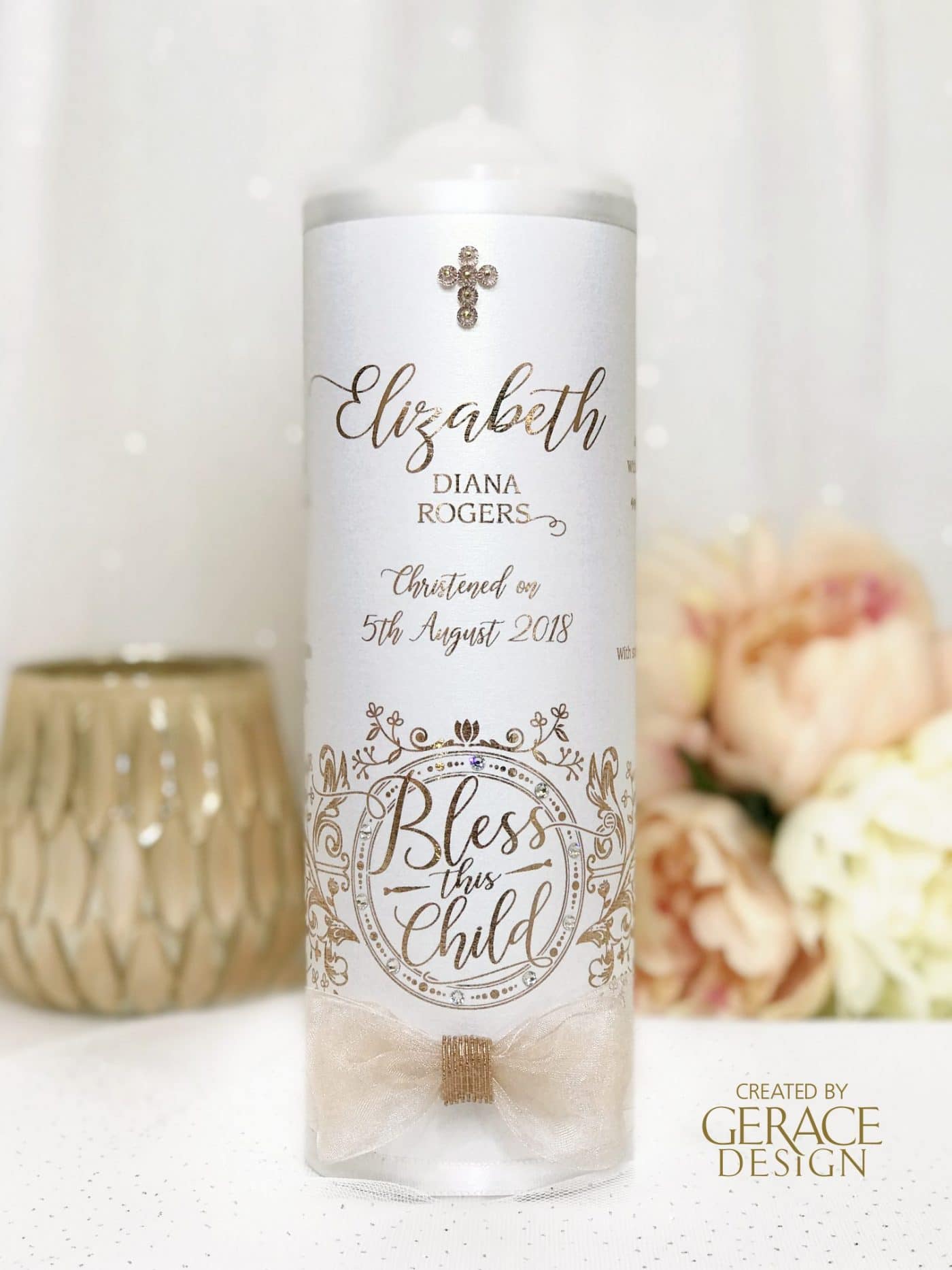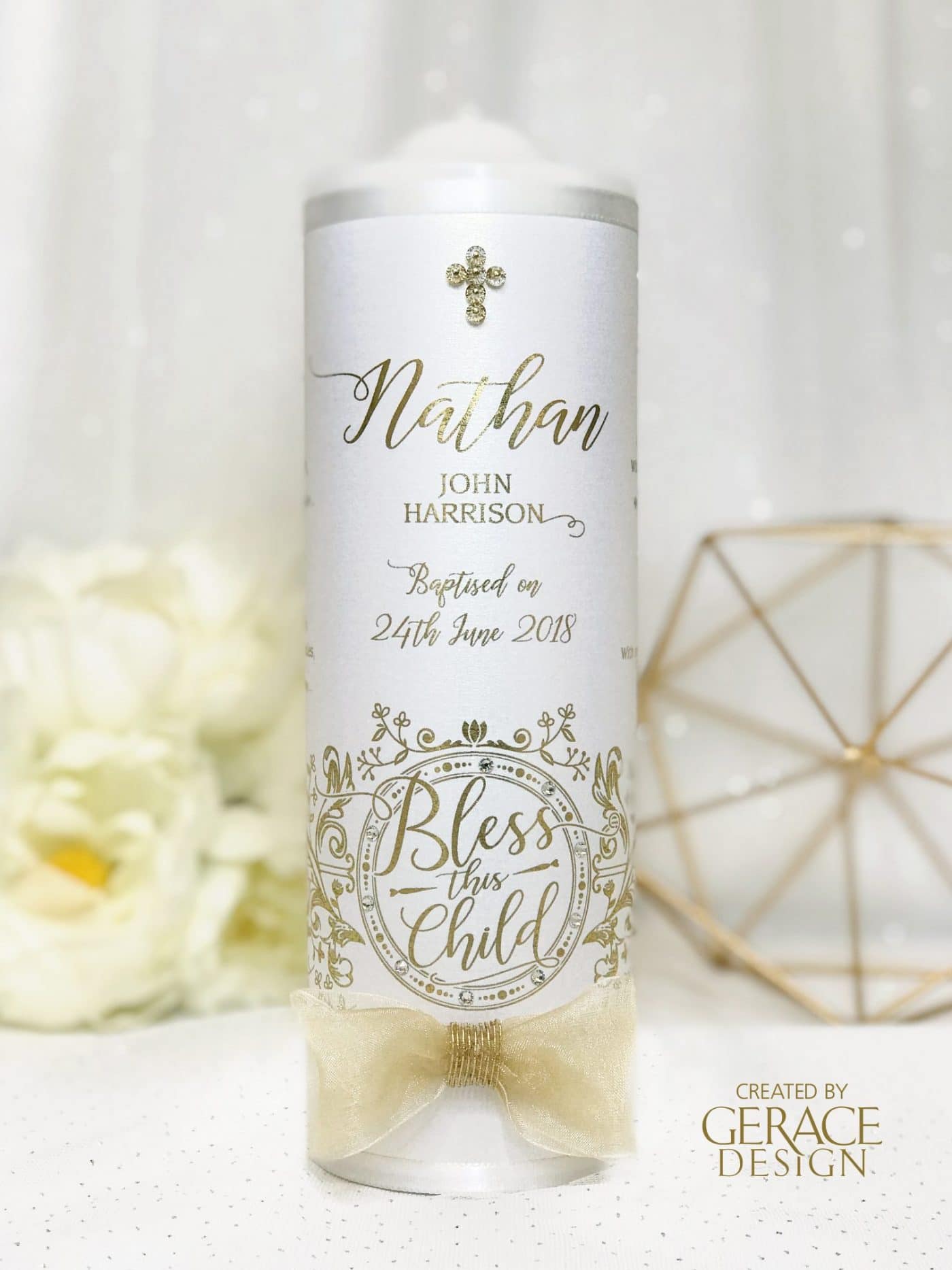 Featuring our hand drawn ‘Bless This Child’ design and finished with an organza gold bowSides of candle has “GOD BLESS THIS CHILD” prayer optional