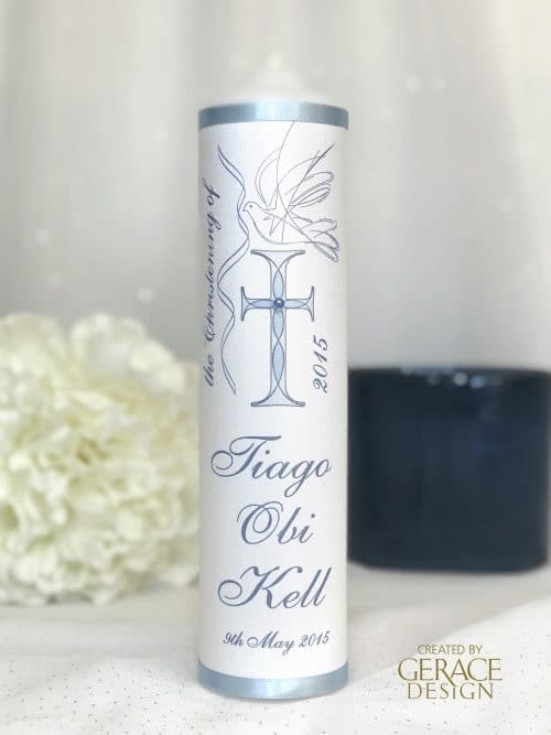Back of candle has “GOD BLESS THIS CHILD” prayer optional