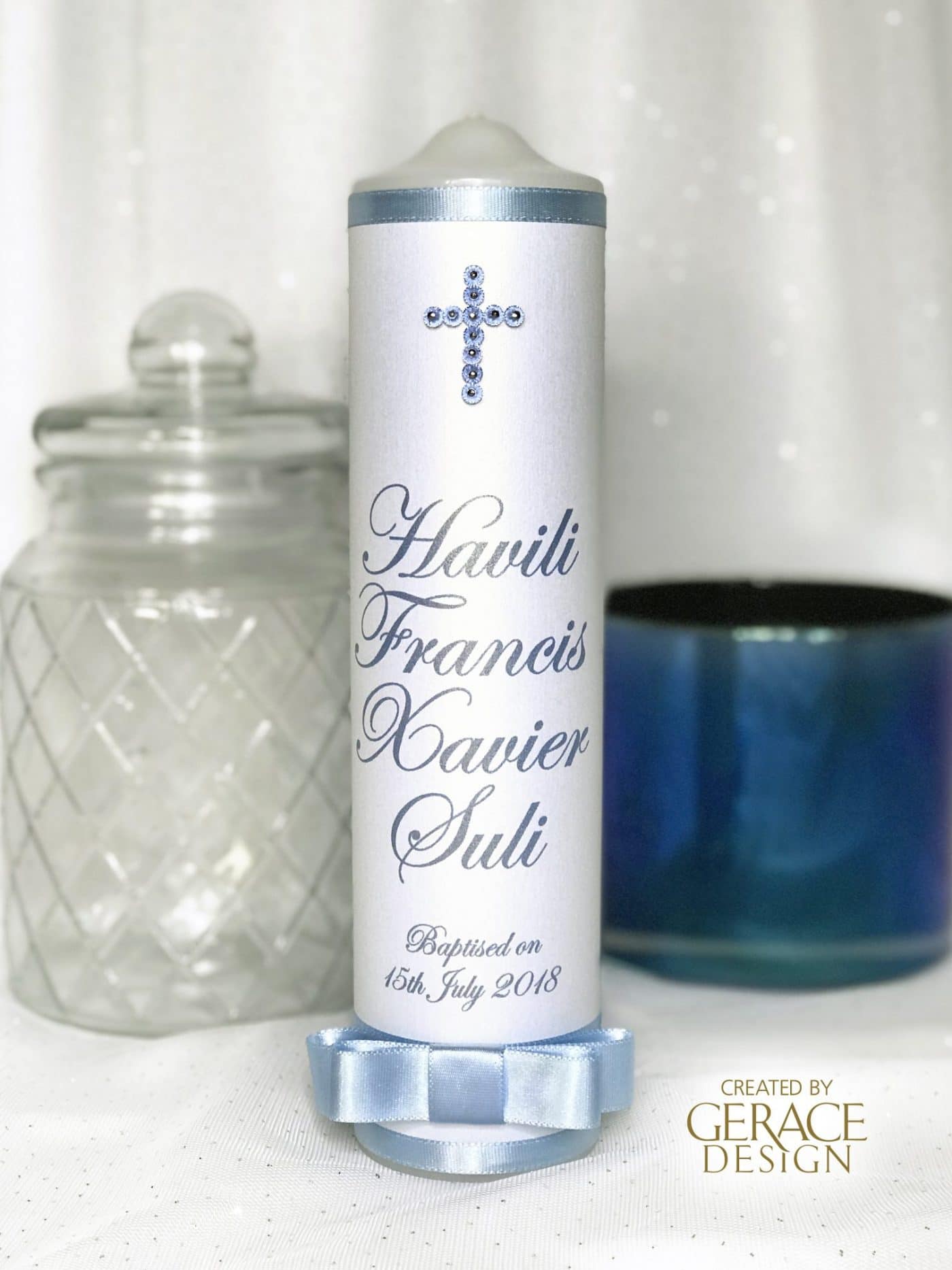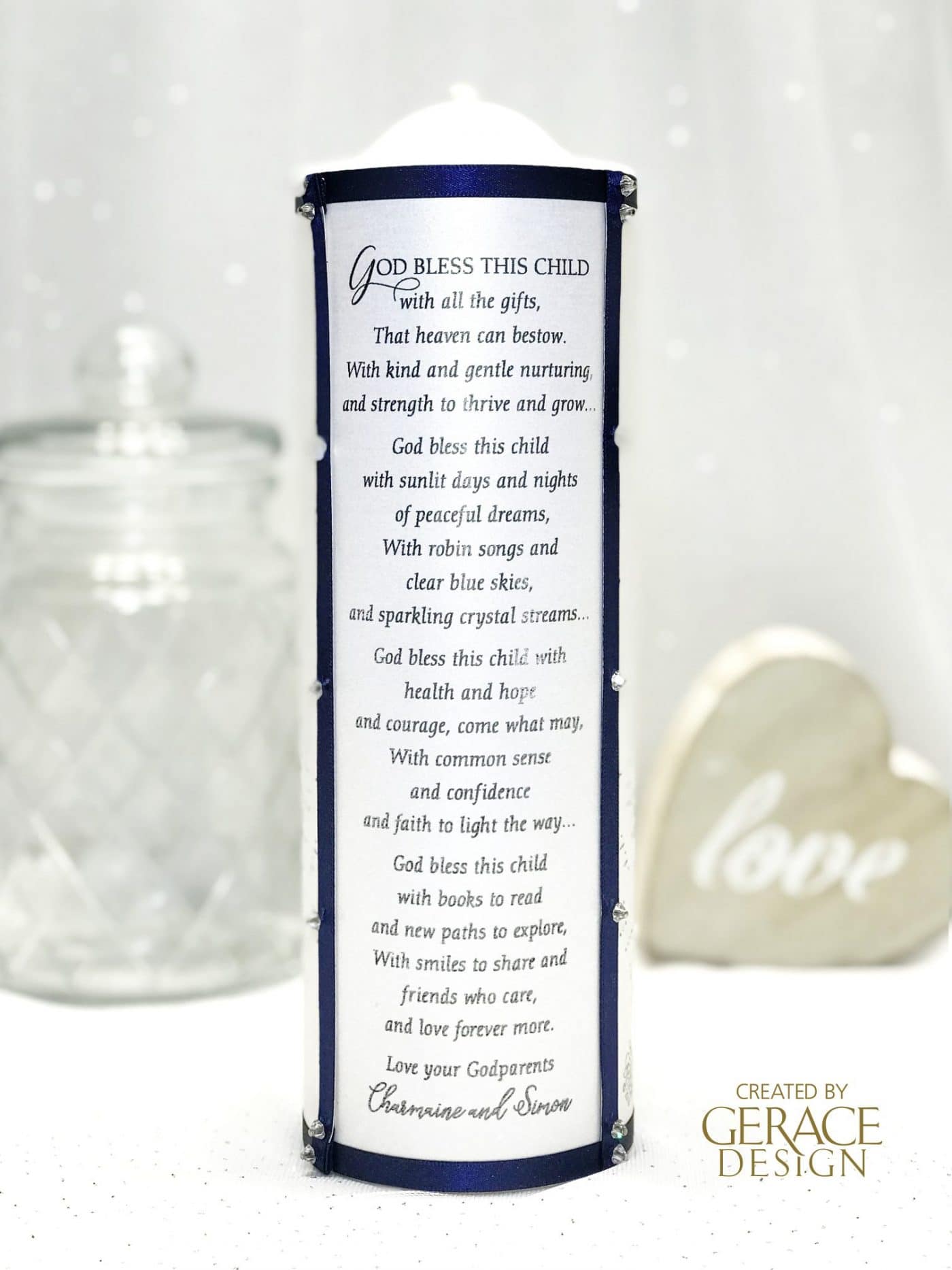 Back of candle has “GOD BLESS THIS CHILD” prayer optional