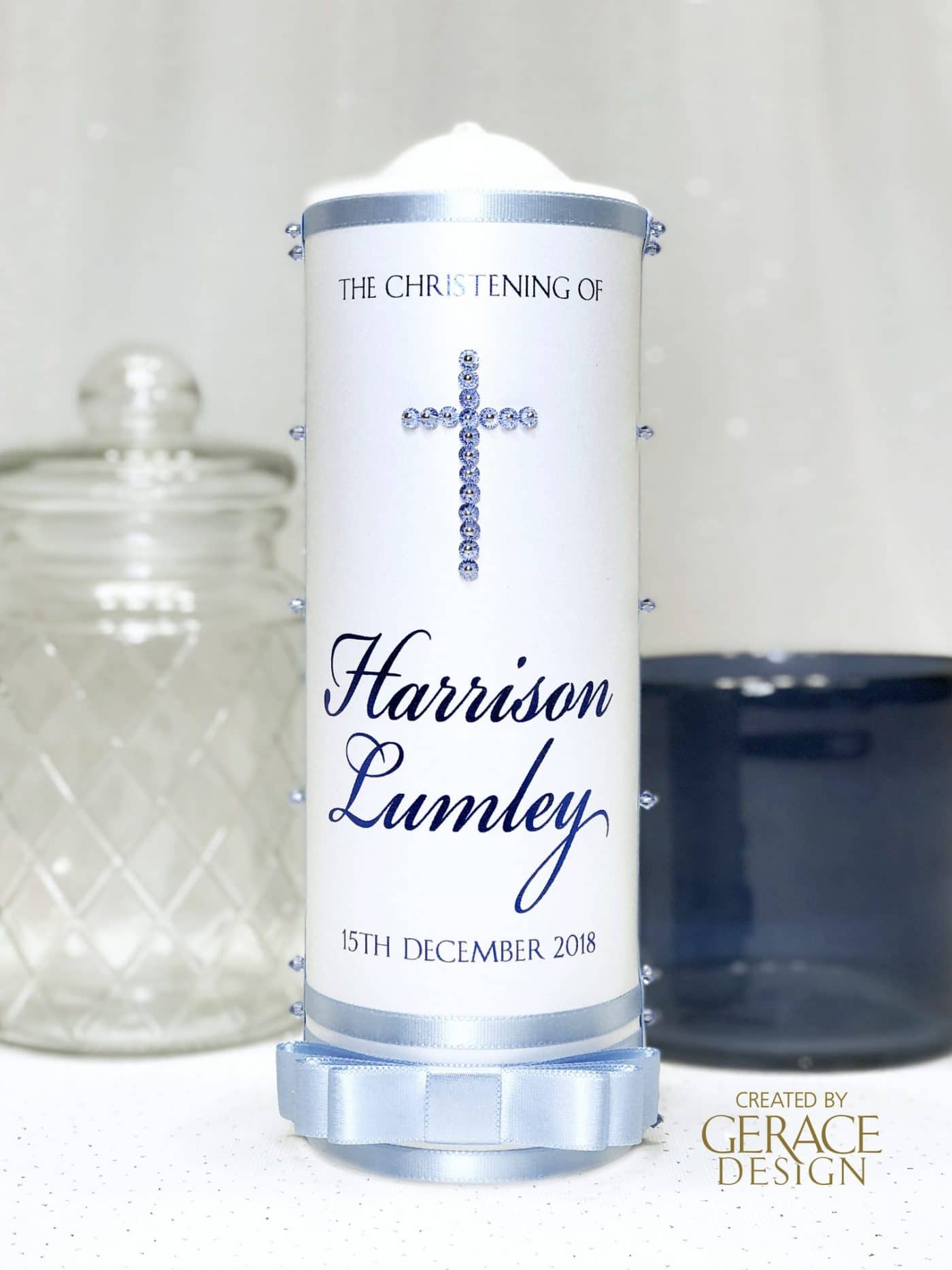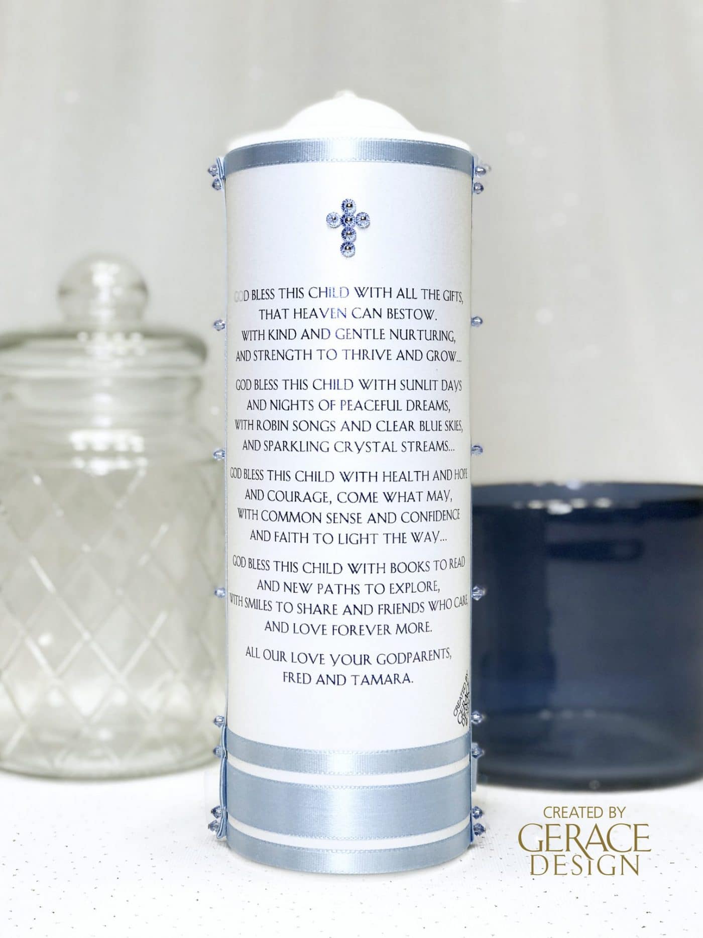 Back of candle has “GOD BLESS THIS CHILD” prayer optional