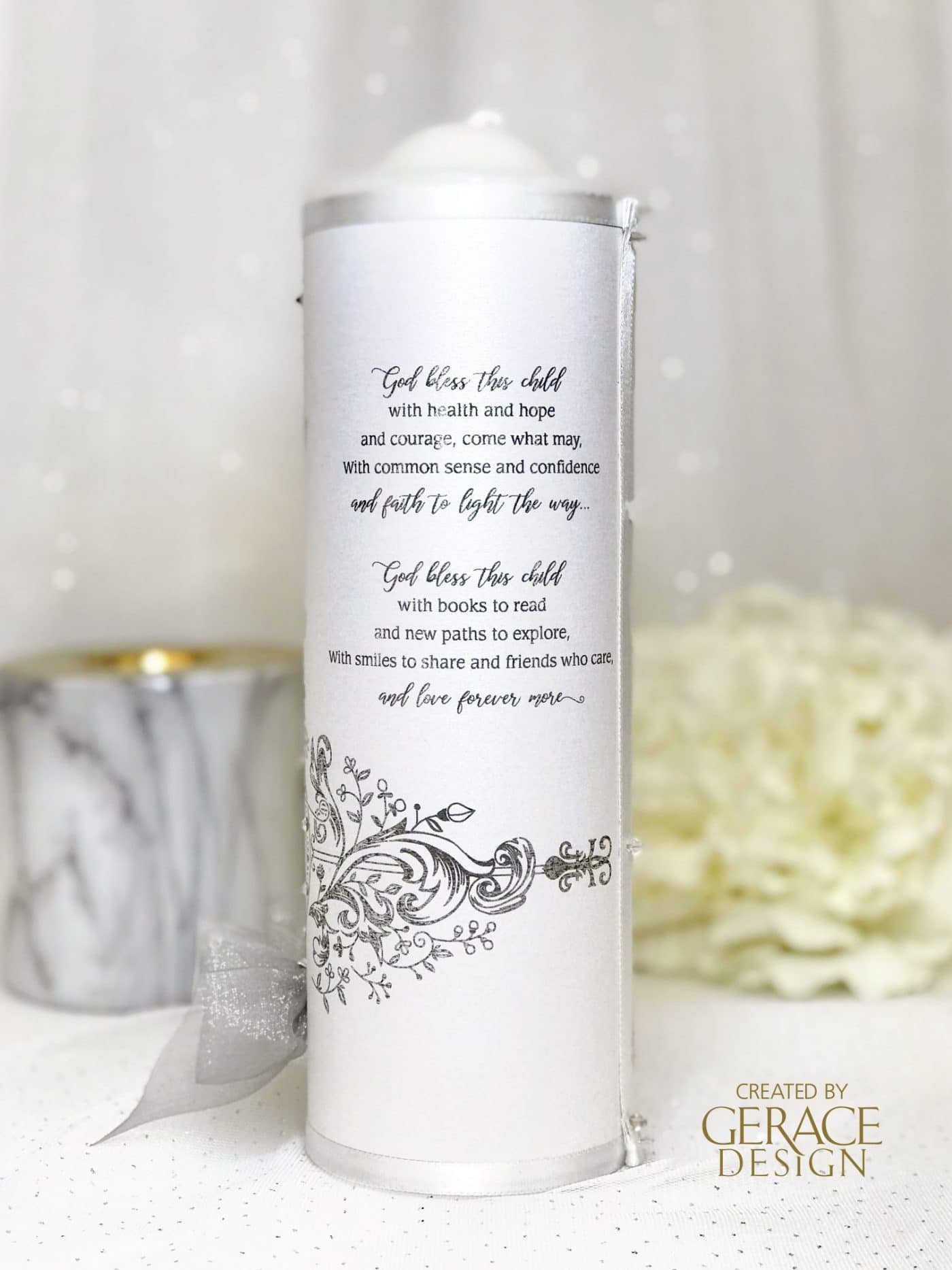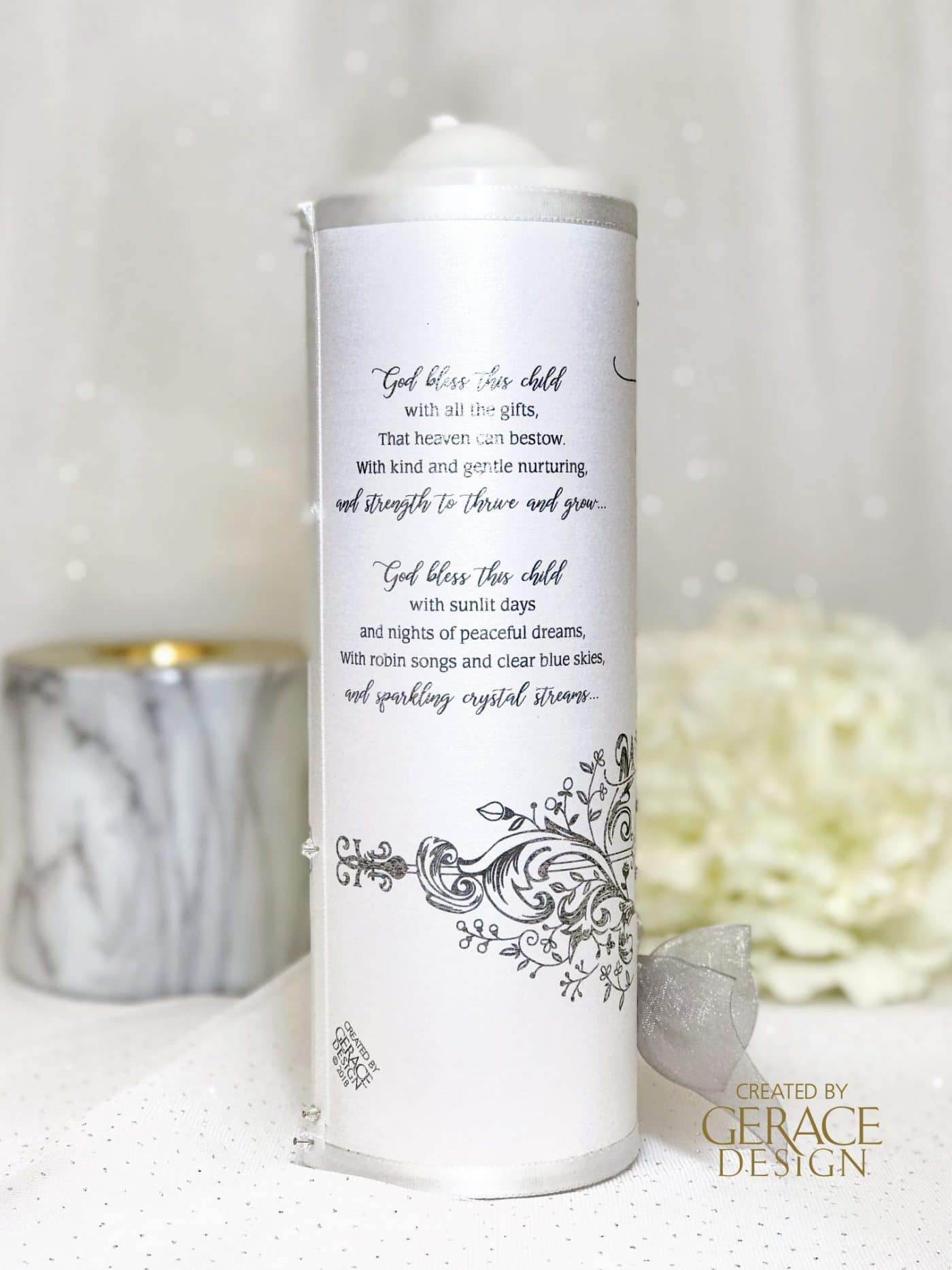 Sides of candle has “GOD BLESS THIS CHILD” prayer optional