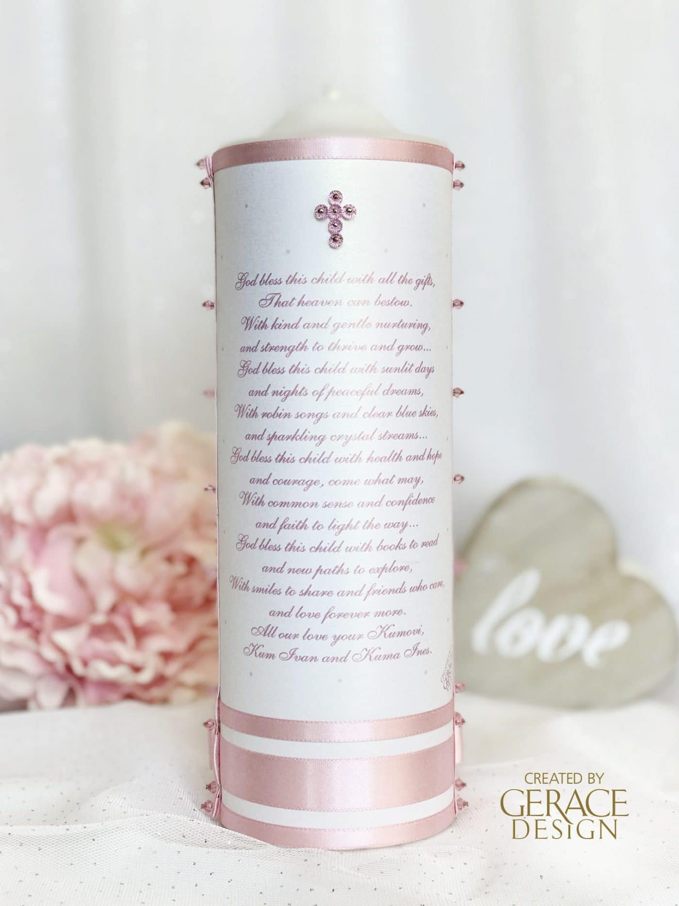 Back of candle has “GOD BLESS THIS CHILD” prayer optional