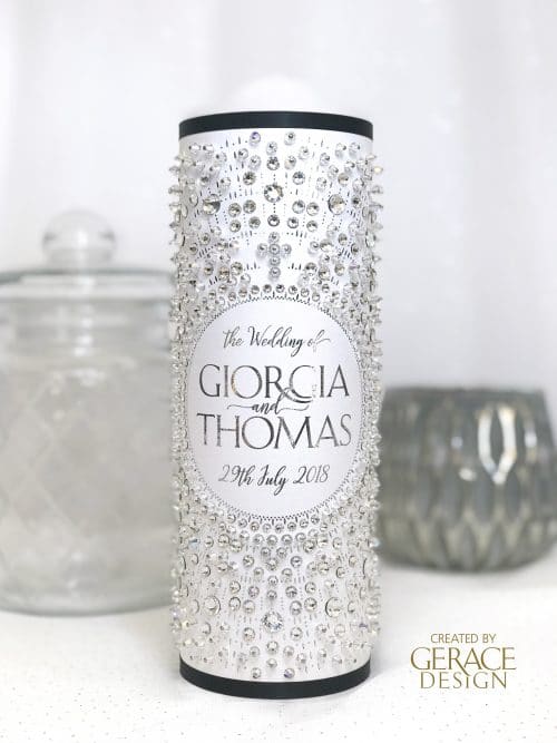 Black satin ribbon, silver foil design & embellished with approxmately 700 genuine Swarovski Crystals Matching family candles - Unity Set (modified) Medium candle size 230mm x 55mm Price $75 each