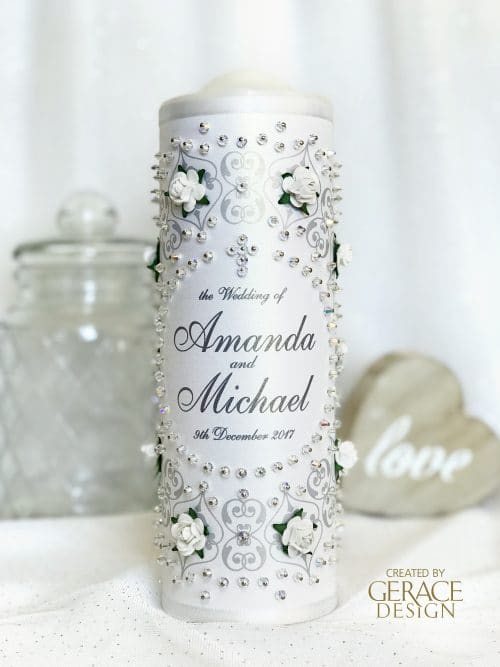 White satin ribbon, white paper roses & embellished with genuine Swarovski Crystals Matching family candles - Unity Set Small candle size 175mm x 55mm Price $50 each