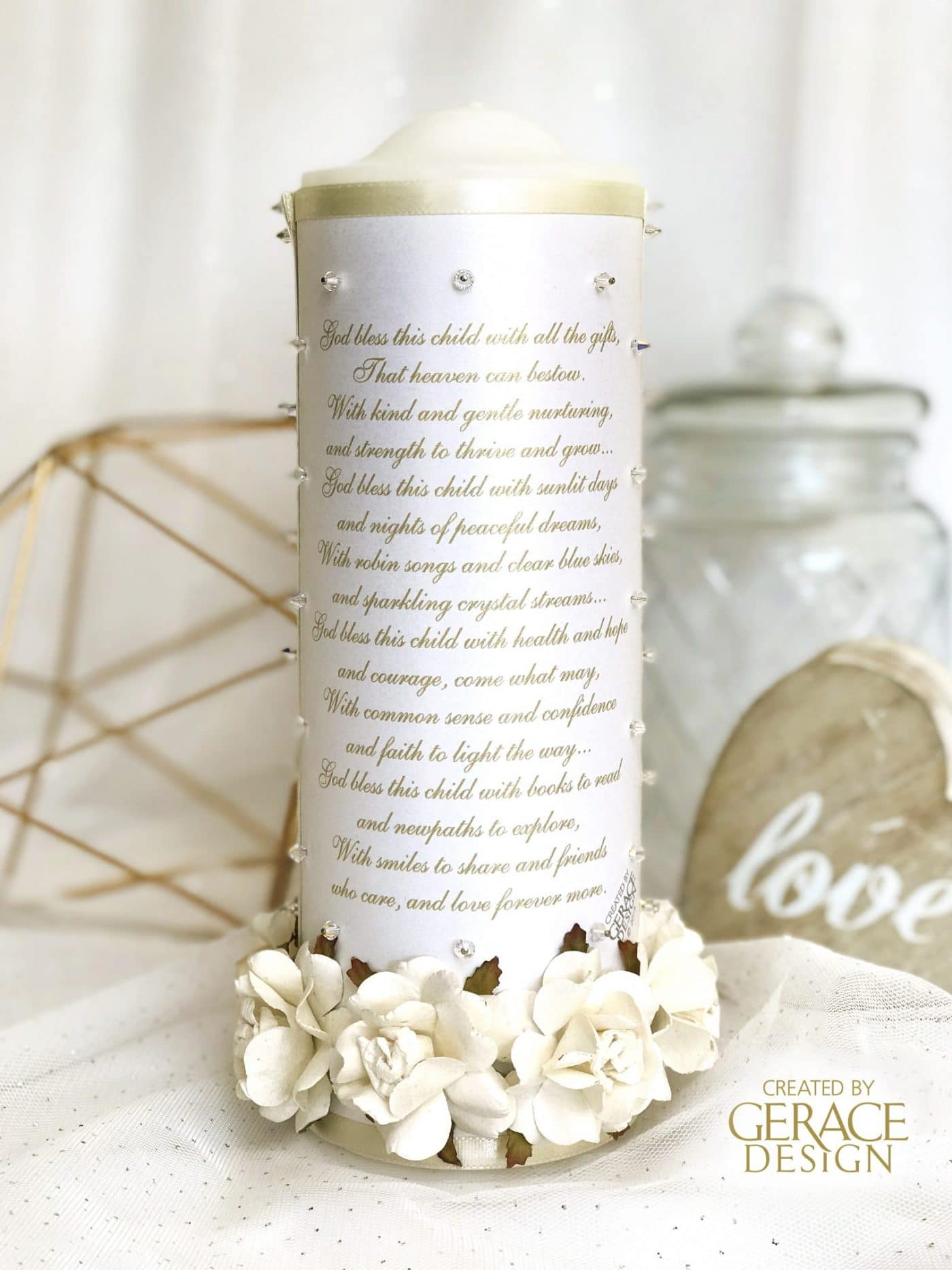 Back of candle has “GOD BLESS THIS CHILD” prayer optional