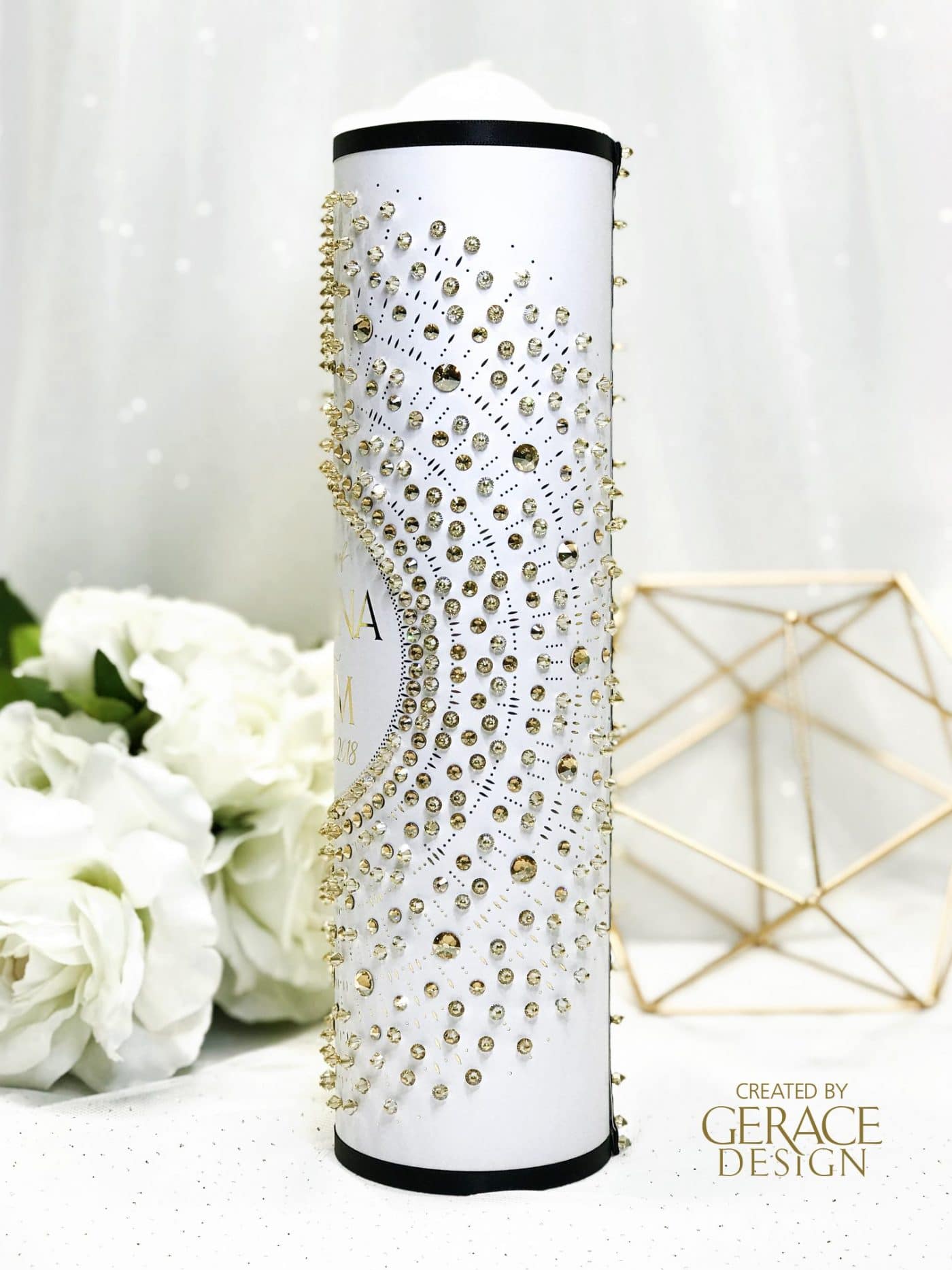 White satin ribbon and embellished with genuine Swarovski Crystals Matching family candles - Unity Set (modified) Small candle size 175mm x 55mm Price $50 each