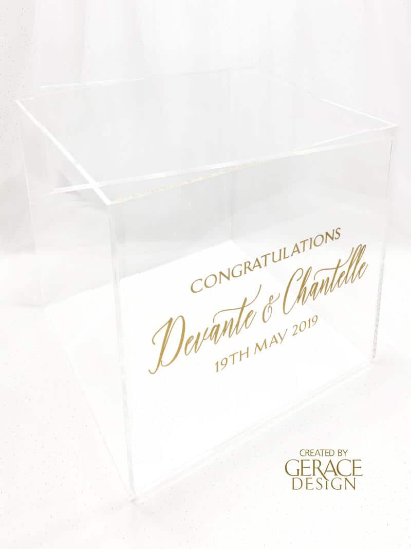 Acrylic square gown box with removable lid and your personalised name in vinyl decal Dimensions 40cm(D) x 40cm(W) x 20cm(H) made from 4.5mm clear acrylic Stock available in our Sydney studio WE RECOMMEND PICK UP WITH ALL OUR BOXES