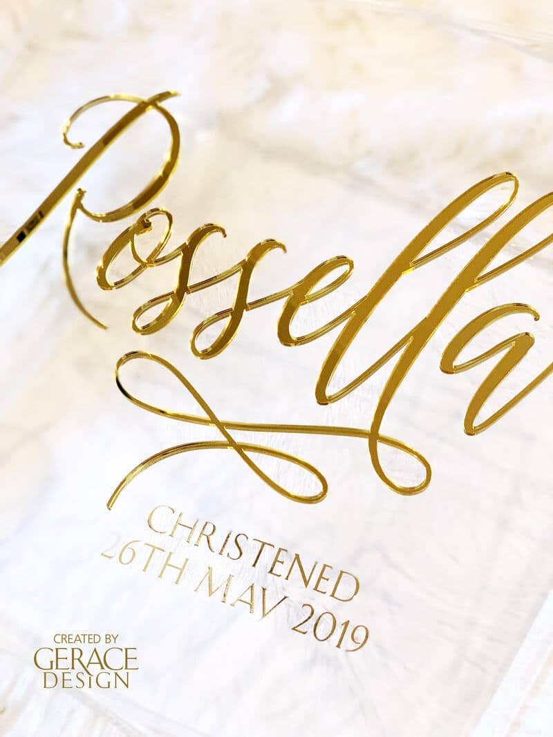 Acrylic square gown box with removable lid and your personalised name in vinyl decal Dimensions 40cm(D) x 40cm(W) x 20cm(H) made from 4.5mm clear acrylic Stock available in our Sydney studio WE RECOMMEND PICK UP WITH ALL OUR BOXES