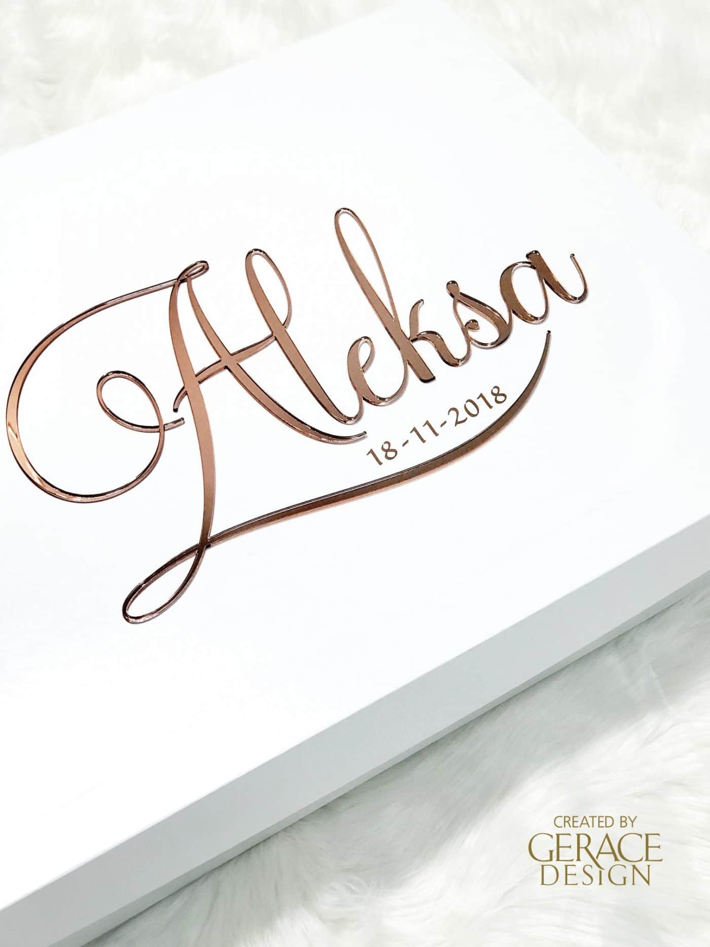 The image shown is an example of a personalised name in Rose Gold acrylic and date in Rose Gold decal
