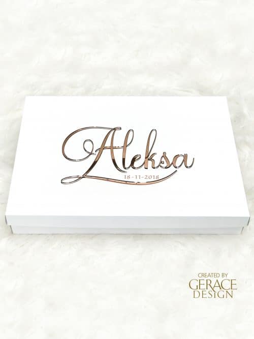 Box Size 400mm (D) x 400mm (W) x 200mm (H) 4.5mm Thickness – Base and Lid PSV400 (2V) includes name and and date in vinyl. All our work is created and produced in our Sydney studio Stock available Colours for this Gown Box design is Blue and Grey. This gown box design matches candle designs 3A, 11A and M1.