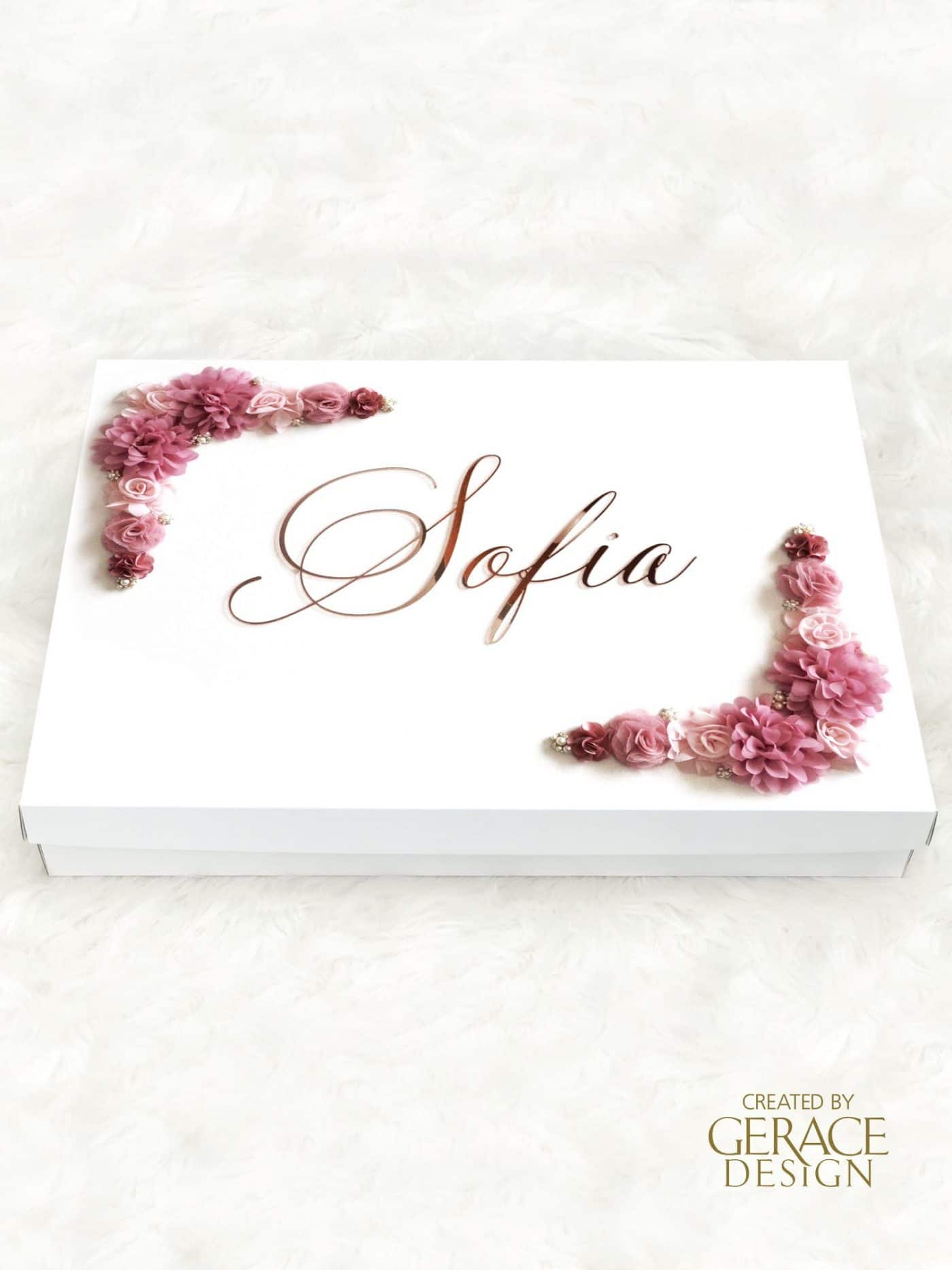 Cardboard rectangle white gown box with removable lid and your personalised name in acrylic and date in vinyl decal Dimensions 70cm(D) x 50cm(W) x 11cm(H) Stock available in our Sydney studio WE RECOMMEND PICK UP WITH ALL OUR BOXES