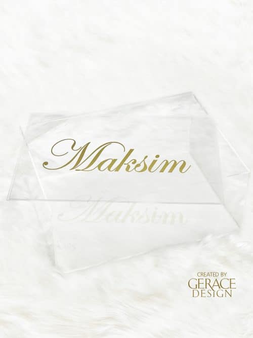 Acrylic rectangle gown box with removable lid and your personalised name in vinyl decal Dimensions 40cm(D) x 60cm(W) x 20cm(H) made from 4.5mm clear acrylic Stock available in our Sydney studio WE RECOMMEND PICK UP WITH ALL OUR BOXES