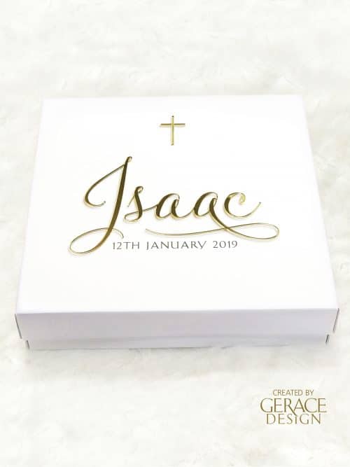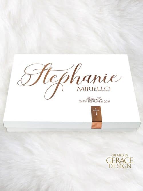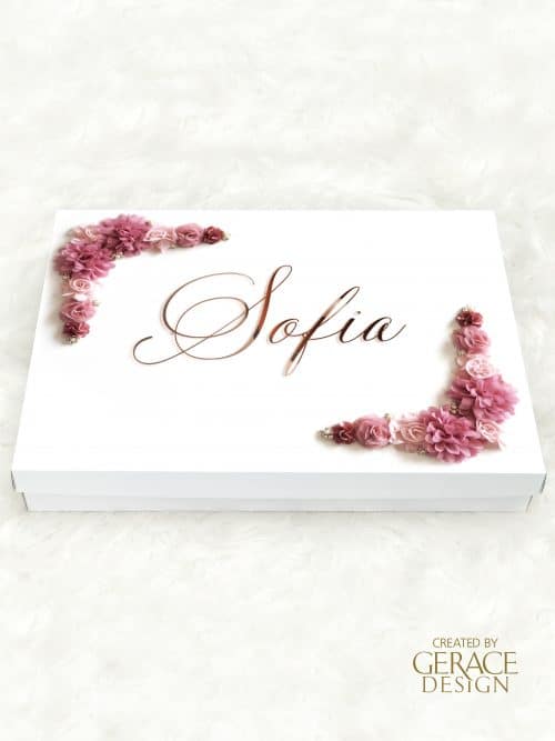 Cardboard rectangle white gown box with removable lid and your personalised name in acrylic and date in vinyl decal decorated to match a candle design of choice. Dimensions 70cm(D) x 50cm(W) x 11cm(H) Stock available in our Sydney studio WE RECOMMEND PICK UP WITH ALL OUR BOXES