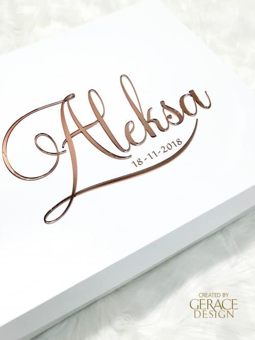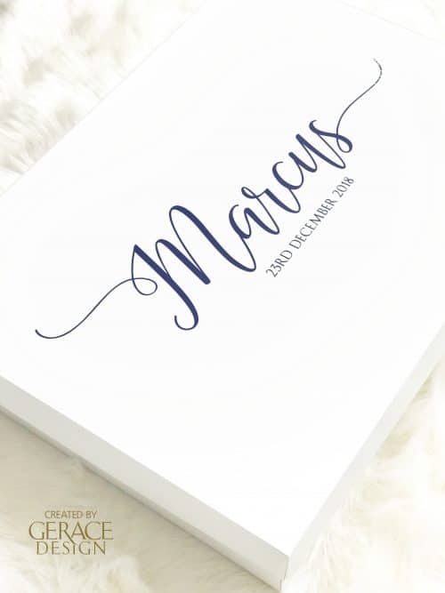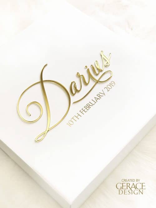 Box Size 400mm (D) x 400mm (W) x 200mm (H) 4.5mm Thickness – Base and Lid PSV400 (2V) includes name and and date in vinyl. All our work is created and produced in our Sydney studio Stock available Colours for this Gown Box design is Blue and Grey. This gown box design matches candle designs 3A, 11A and M1.