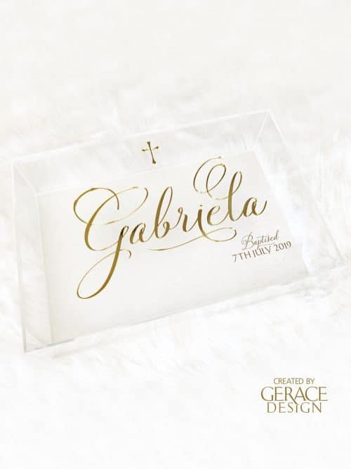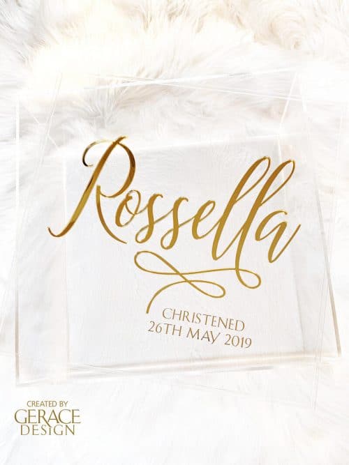 The image shown is an example of a personalised name and cross in Gold acrylic and date in Gold decal